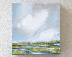 Small Marsh Landscape Painting with White Clouds, Original 8"...
