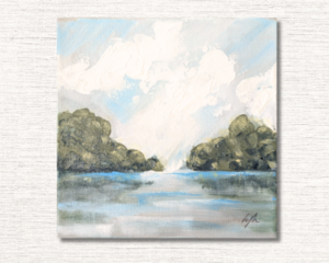 Small Lake Shore Painting with Impasto Texture White Clouds, ...