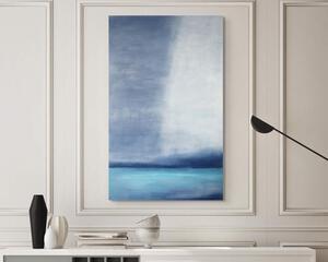 Abstract Ocean painting, painted in acrylic on cradled wood panel. Stormy skies are meeting a dark ocean intersected by soft gold crested minimalist waves. This original deep blue and gold painting is painted in a slightly distressed style reminiscent of old photographs, and the cradled birch panel surface lends an even more organic look to the melancholy scene.